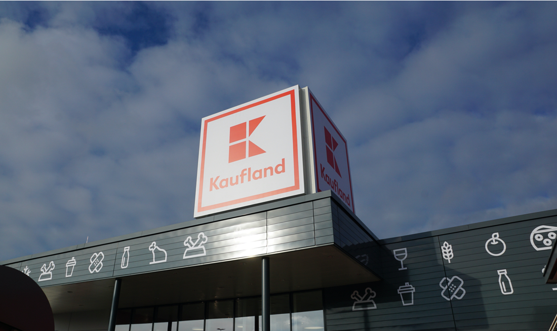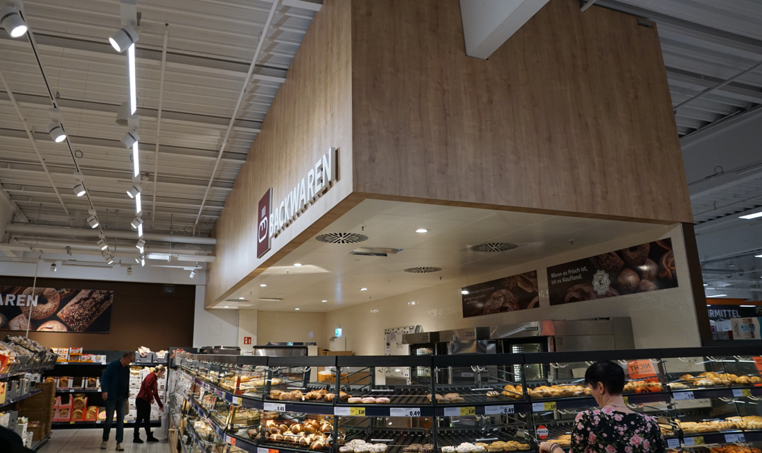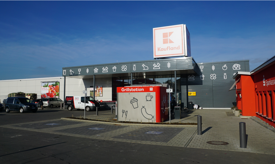 Beim Umbau des Kauflandes ist ein großzügiger neuer Eingangsbereich mit überdachtem Stellplatz für Einkaufswägen realisiert worden. Hier wurden – wie in anderen Kaufland-Märkten – hochwertige Metallplatten als Fassadenelemente angebracht. Der neu errichtete Backshop und eine komplett neue Gestaltung der Eingangsfassade zu den Konzessionären erwartet die Kunden im Innern.