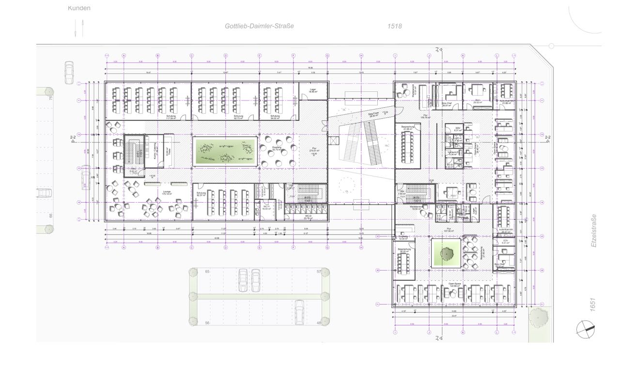 Auf das an zwei Straßenzügen angrenzende Grundstück sollte an eine bestehende Lagerhalle ein Ausstellungs- und Bürogebäude mit Schulungsräumen geplant werden.