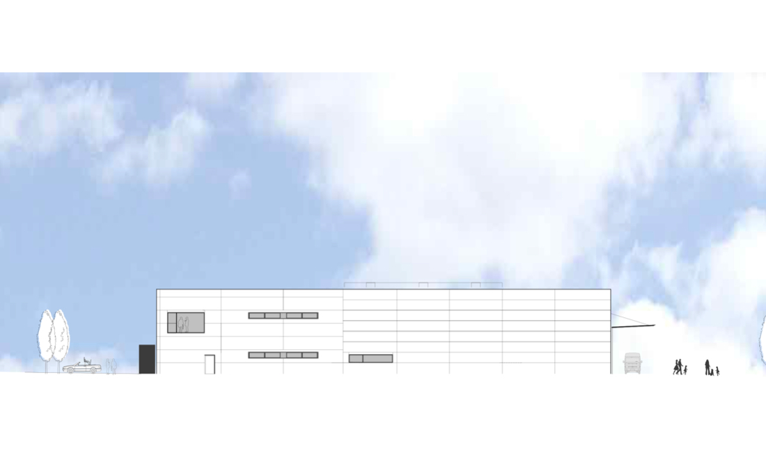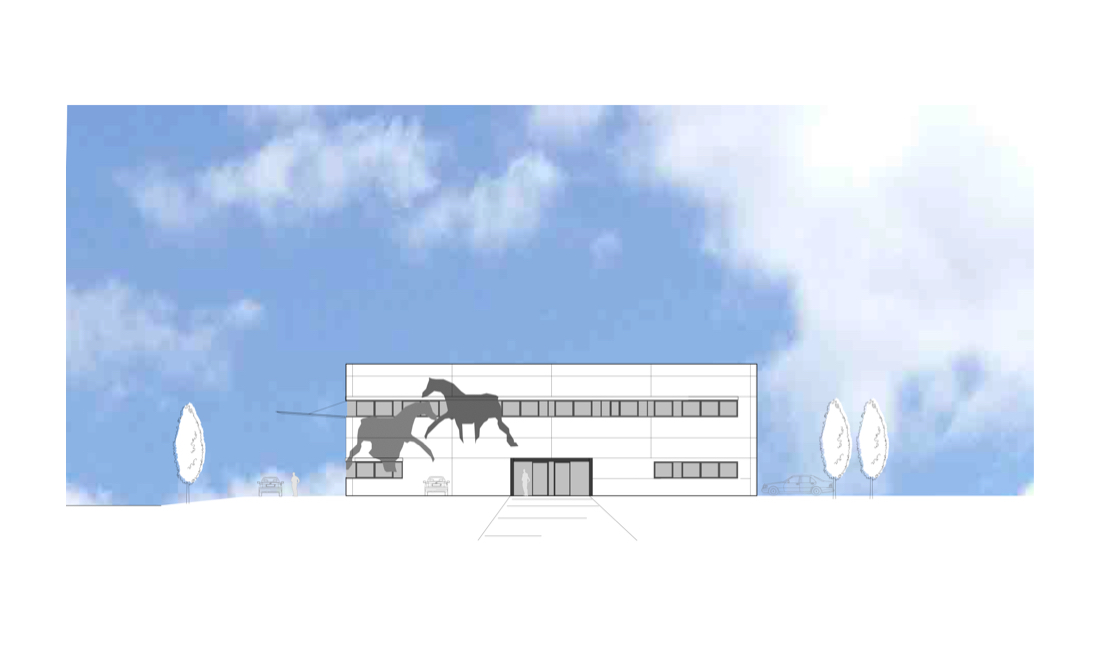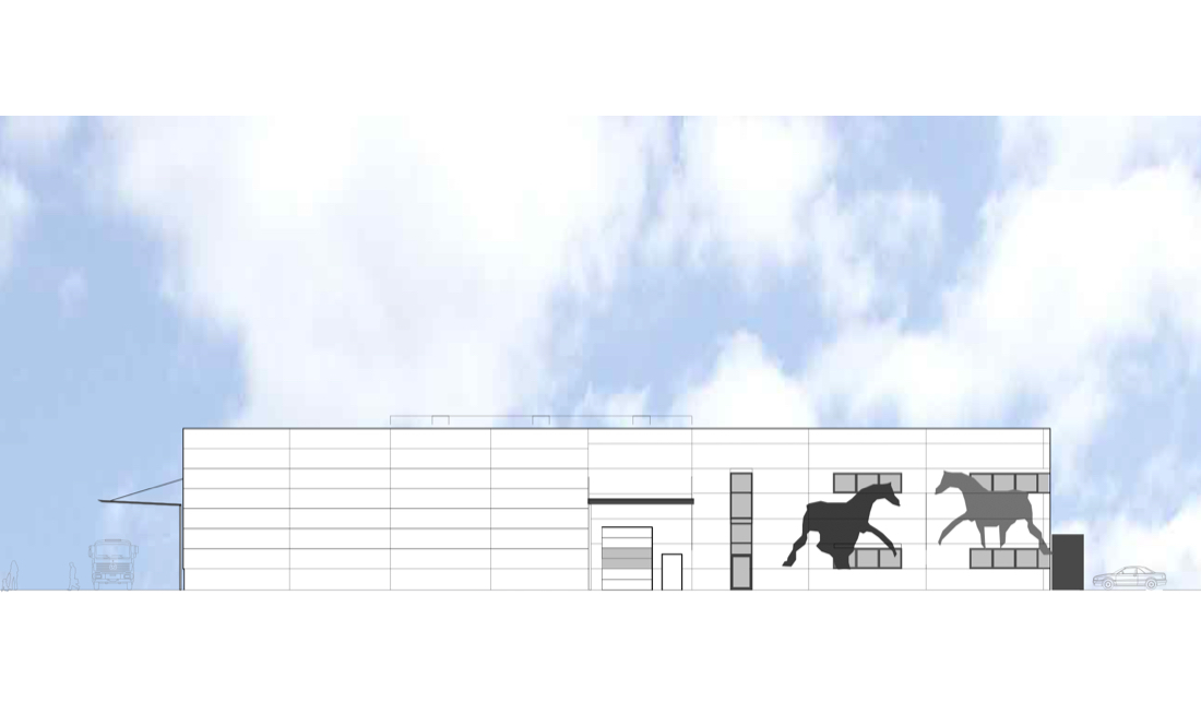 Der Neubau für Pferdebedarf gliedert sich in einen Lager- und einen Verkaufsbereich. Die Anlieferung erfolgt von der Nord-Ost-Seite. Der Besuchereingang befindet sich auf der Südwestseite. Große Vordächer gewähren einen geschützten Eingangsbereich. Die gleichmäßige Panel-Fassade wird durch aufgedruckte graphische Elemente aufgelockert.