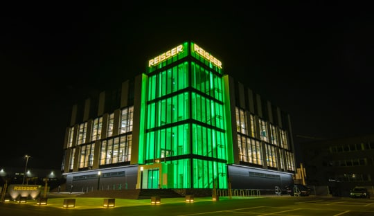 Am Abend leuchtet der Glaskubus, die vertikale Verkehrsfläche des Gebäudes, von Weitem.