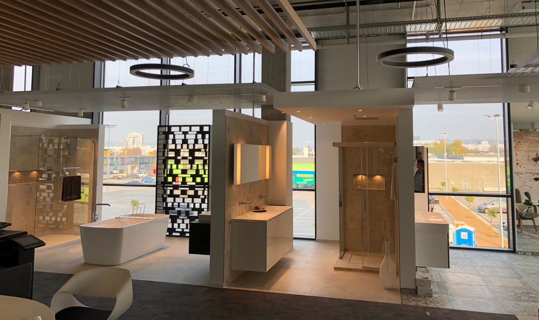 Eingebettet im Verwaltungstrakt mit dem Fachmarkt, den Ausstellungsbereichen, den Schulungsräumen und einer Dachterrasse befindet er sich an der Spitze des gesamten Ensembles.
