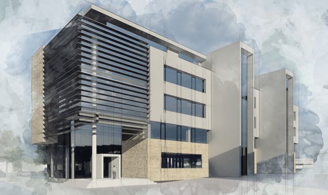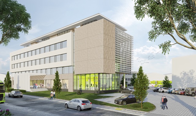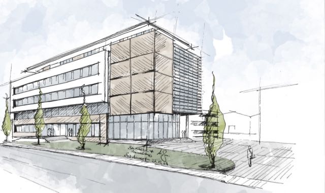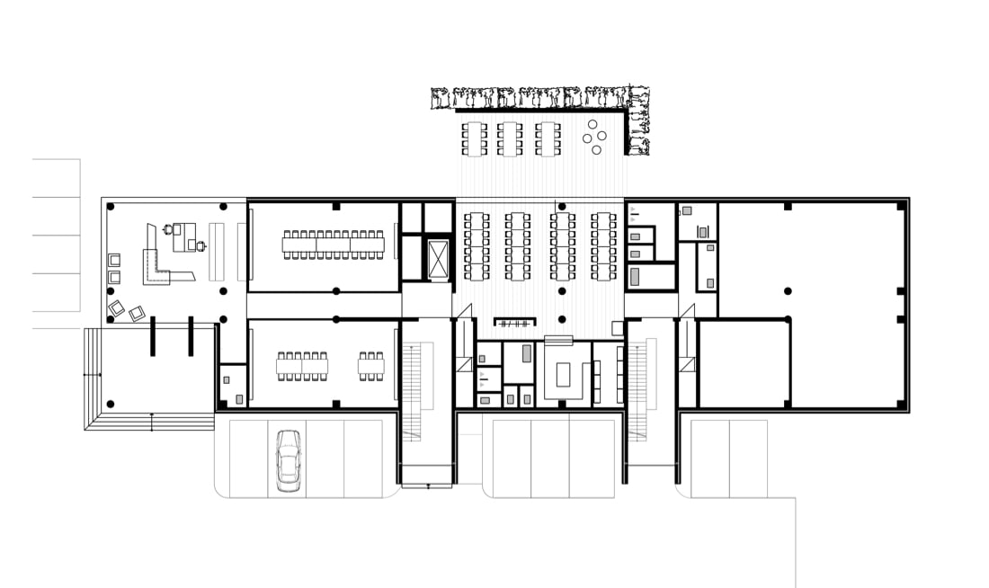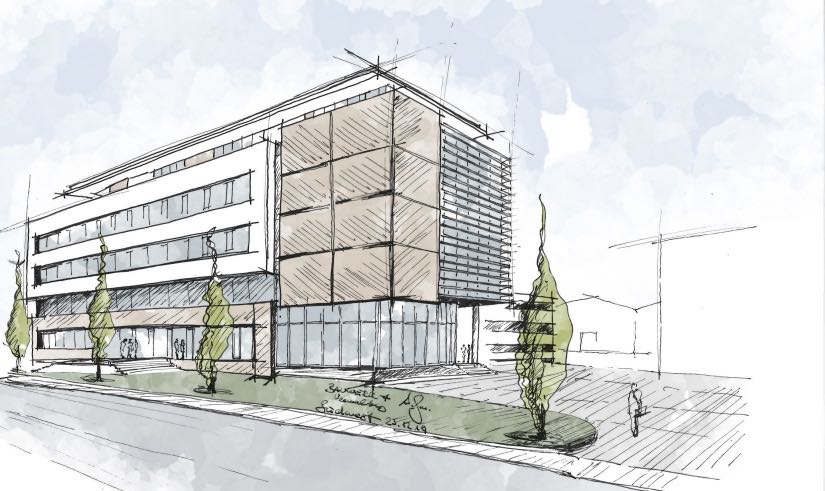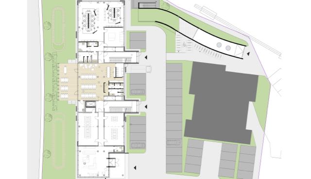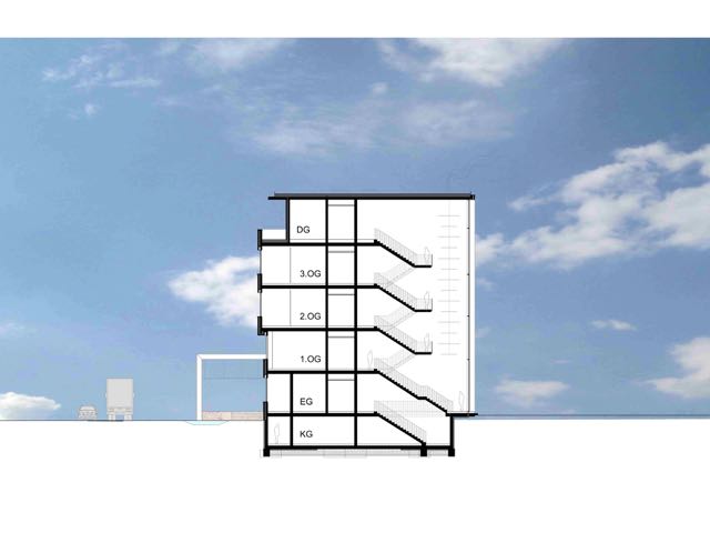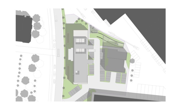 Der schmale lange Riegel des Verwaltungstraktes schließt das inhomogene Betriebsgelände optisch ab und fungiert als Entree und Verbindungsstück zum Werk. Die Erschließung erfolgt auf der Ostseite. Ein prominenter Eingang weist in das Gebäude.