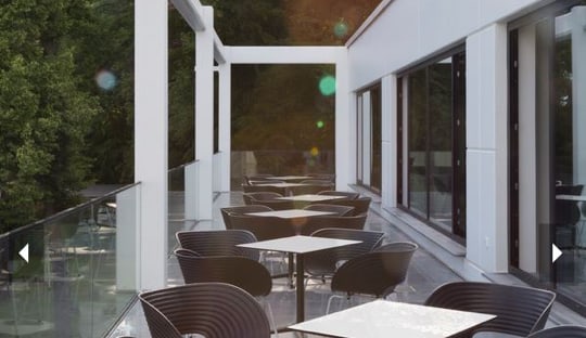Ein großzügiger, ansprechender Mitarbeiter-Terrassenbereich mit dem Blick ins Grüne befindet sich im 1. OG.