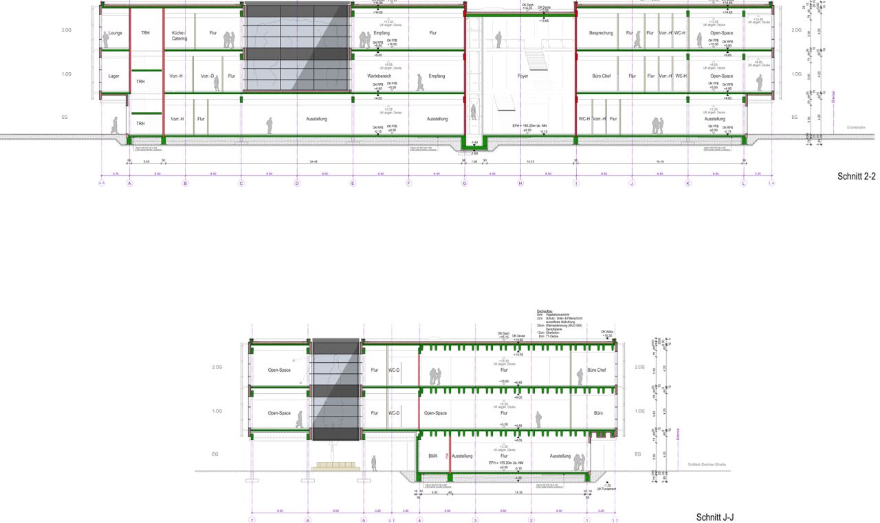 So ergibt sich eine aufgelockerte Fassade, die je nach Nutzerverhalten unterschiedlich erscheint. Die Büro- und Schulungsräume befinden sich in den beiden Obergeschossen, die über Freitreppen vom offen gestalteten Foyer aus erreicht werden. Die durch die Glasfassaden sehr hellen und großzügigen Ausstellungsflächen sind im Erdgeschoss angeordnet. Zwei Lichthöfe im Inneren des Gebäudekomplexes sorgen zusätzlich für eine gute Belichtung sowie eine angenehme und freundliche Arbeitsatmosphäre.