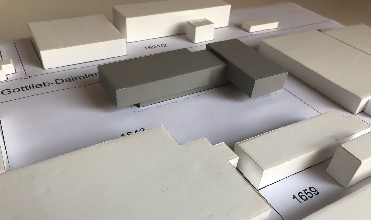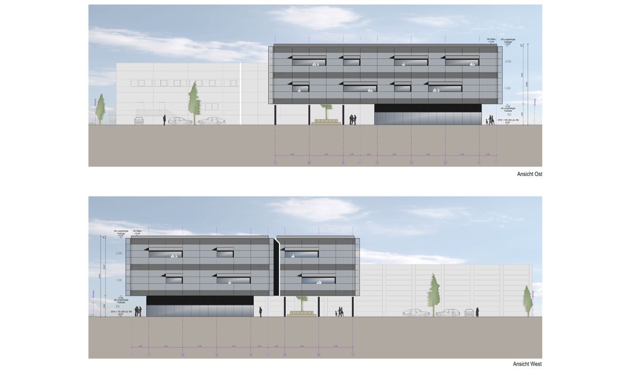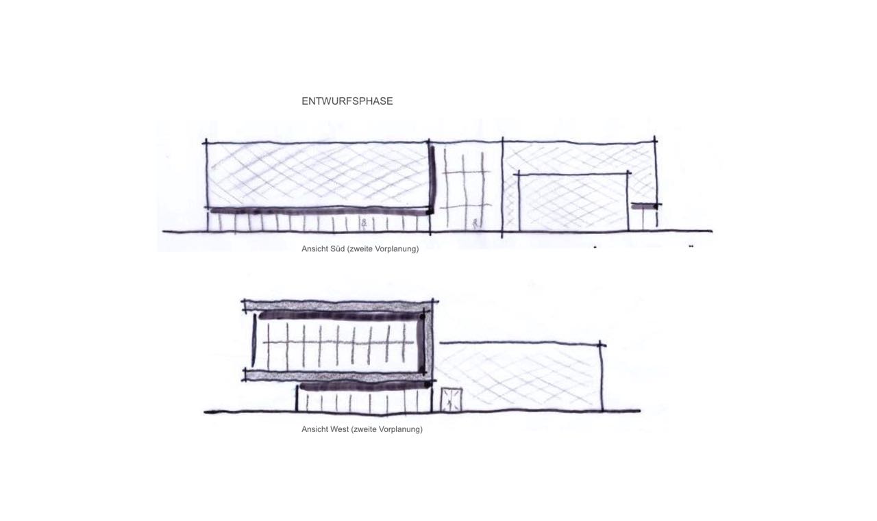 Auf das an zwei Straßenzügen angrenzende Grundstück sollte an eine bestehende Lagerhalle ein Ausstellungs- und Bürogebäude mit Schulungsräumen geplant werden.