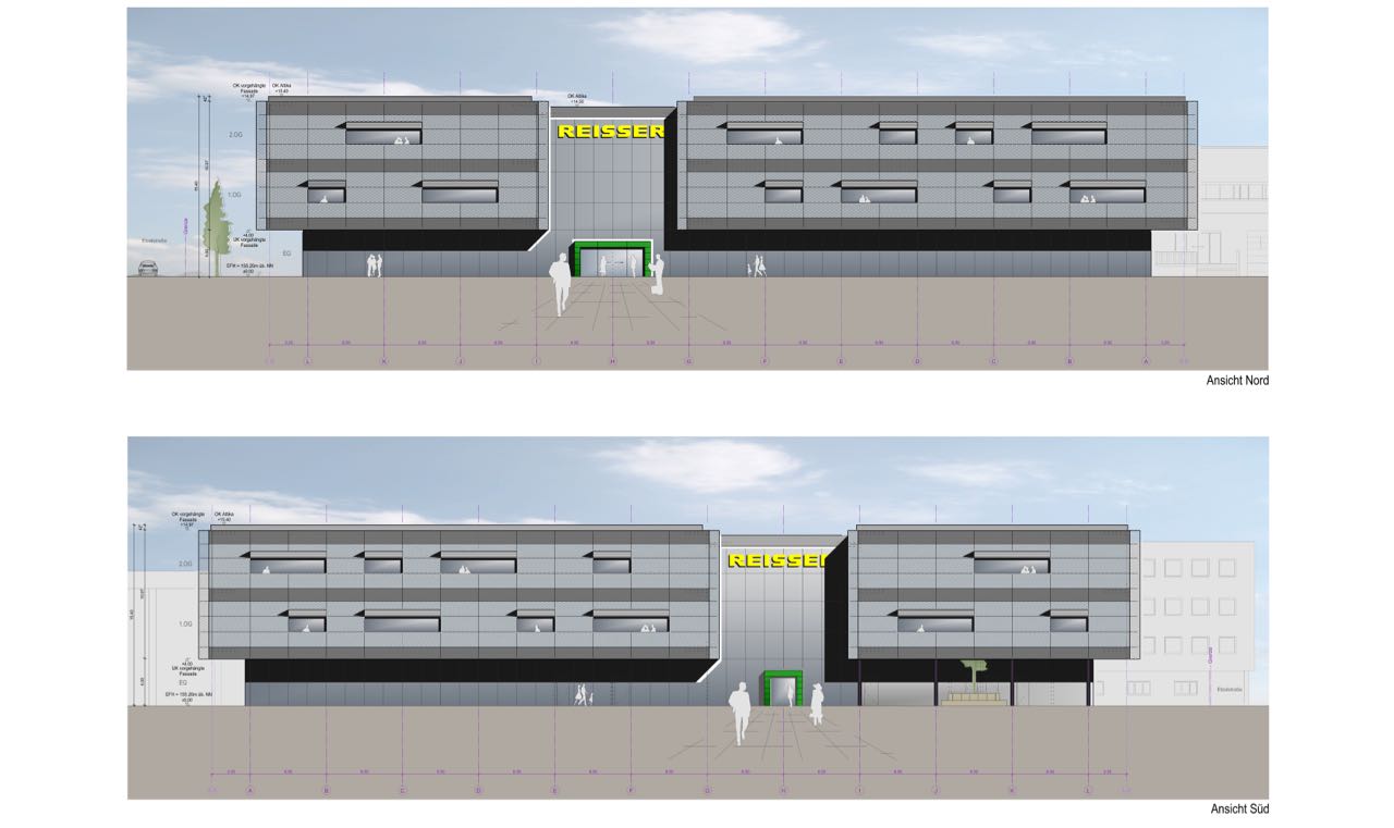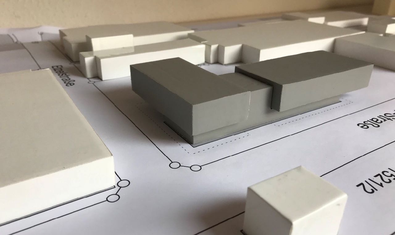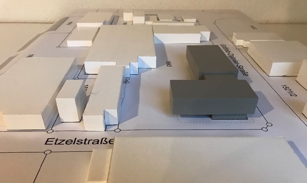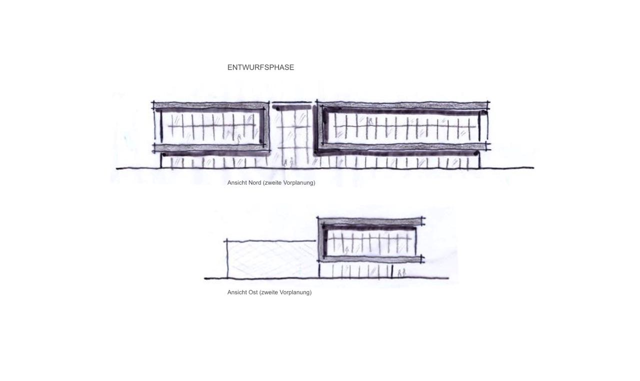 Auf das an zwei Straßenzügen angrenzende Grundstück sollte an eine bestehende Lagerhalle ein Ausstellungs- und Bürogebäude mit Schulungsräumen geplant werden.