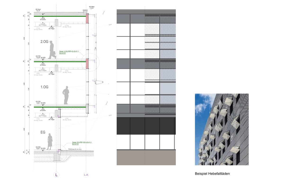 Die gute Lage ermöglichte ein repräsentatives Gebäude, das sich von der vorhandenen Bebauung abhob: Um das rechteckige Grundstück von beiden Straßen gut zu präsentieren, wurde eine L-Form gewählt. Das dreigeschossige Gebäude hat eine Pfosten-Riegel-Fassade aus Glas, wobei die beiden Obergeschosse über das EG auskragen. Dort schützt eine zusätzlich vorgehängte Streckmetallfassade mit elektrisch gesteuerten Hebefaltläden vor Sonne und vor Blicken.