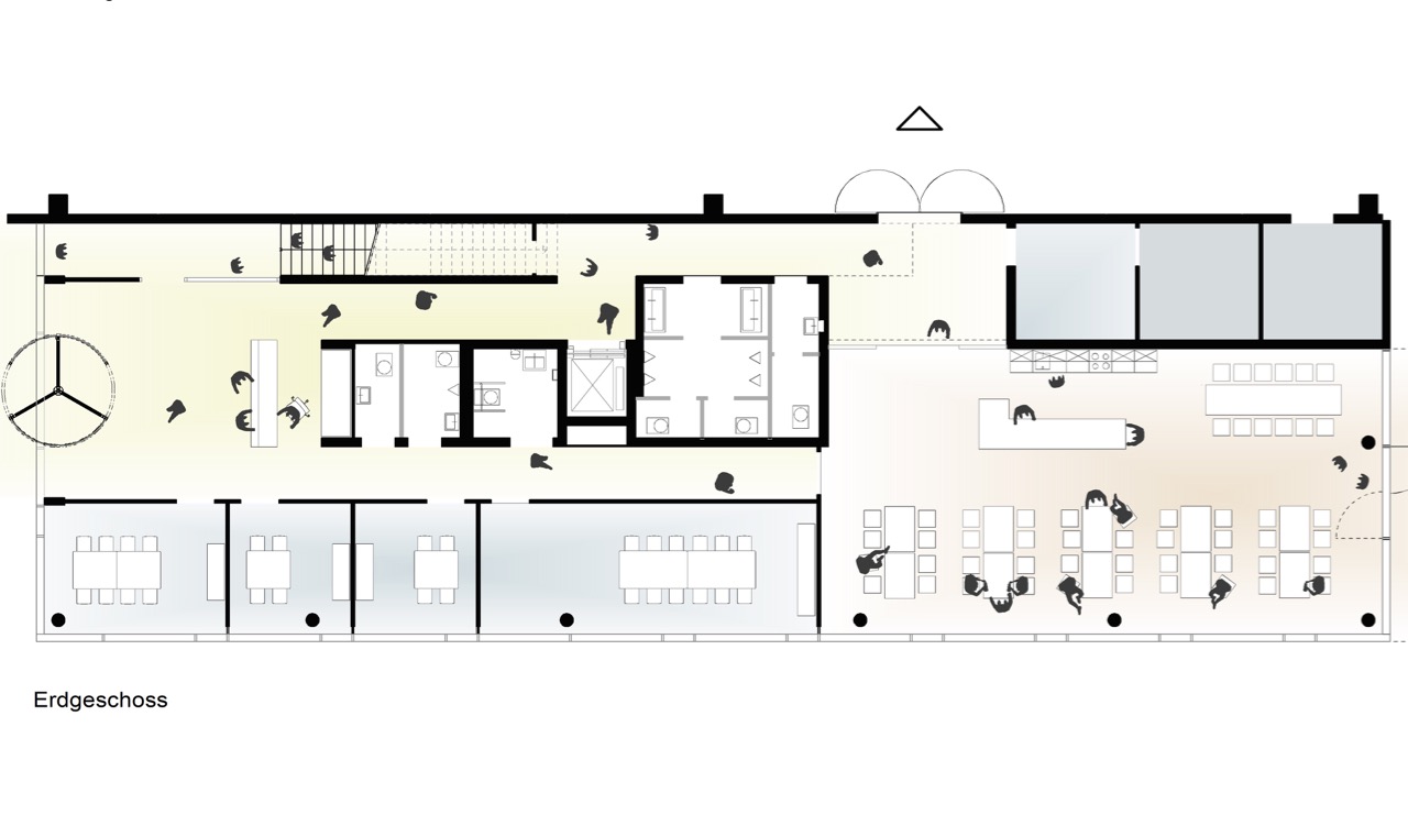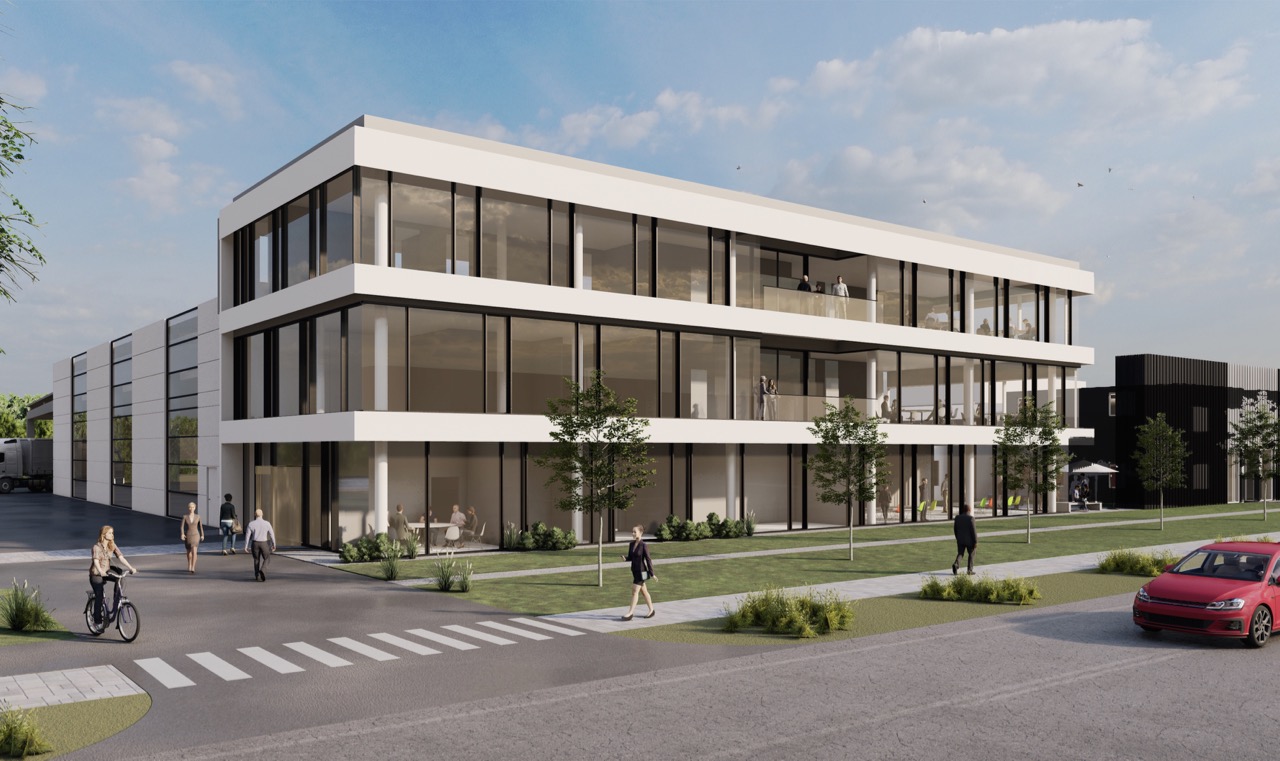Das Verwaltungsgebäude präsentiert sich entlang der Straße und ist der neuen Montagehalle direkt vorgelagert. Die Pfosten-Riegel-Fassade gewährleistet eine Belichtung, die tief ins Rauminnere hineinreicht. Die offenen Grundrisse ermöglichen flexible und veränderbare Räume, die je nach Anforderungen angepasst werden können. Im Erdgeschoss befinden sich der Empfangsbereich für Kunden, sowie Aufenthaltsräume und Terrassen. In den Obergeschossen sind die Konstruktionsbüros der Projektteams, die Buchhaltung und die Geschäftsführung zu finden. Ein Zwischenbau wird in Zukunft die bestehenden Produktions- und Montagehallen mit dem Neubau verbinden. Die Fassade des im Jahre 2010 entstandenen Betriebsgebäudes wird mit einer Strangprofilfassade an die Neubauten angepasst.