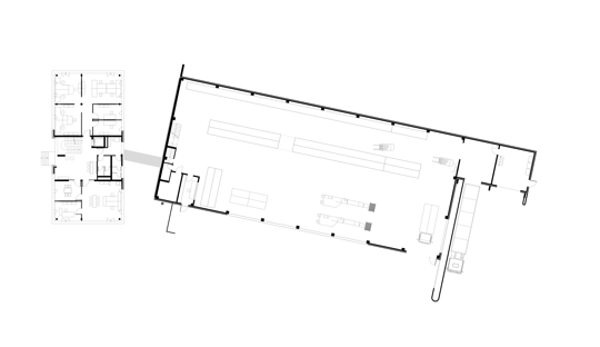 Über das mittlere Geschoss mit dem Foyer gelangt man in alle weiteren Bereiche. Ein geschlossener Korridor im Gartengeschoss verbindet den Verwaltungstrakt mit den Hallen.
