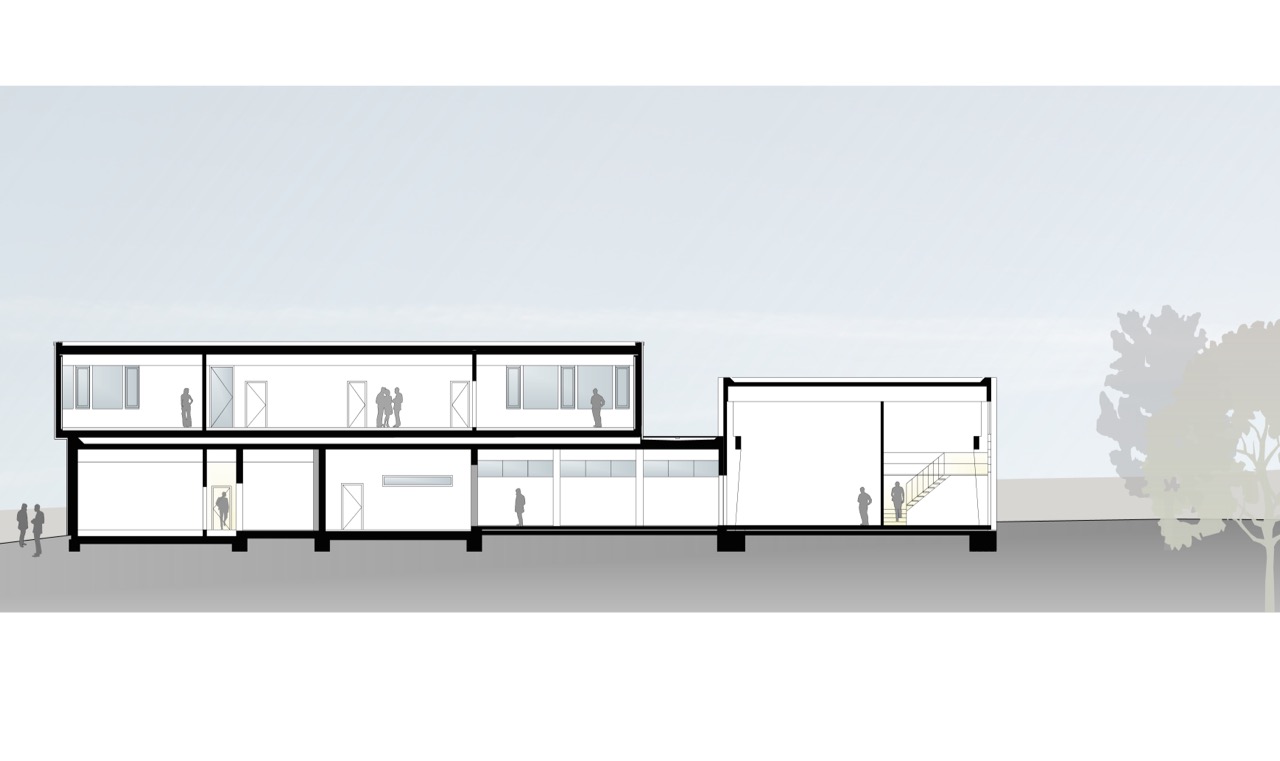 Das in die Jahre gekommene Betriebsgebäude der Landes-Wasserversorgung wird im EG umgebaut, um den neuesten Anforderungen an den Versorgungsbetrieb zu entsprechen. Die Aufstockung über dem Erdgeschoss mit modernen Büros ist in Holzbauweise geplant. Die großen Fensterbänder sichern eine gute Beleuchtung im Innern und strukturieren die Süd-West-Fassade. Das 2-geschossige Portal - mit dem Treppenaus in Massiv-Bauweise - signalisiert markant den Eingang.