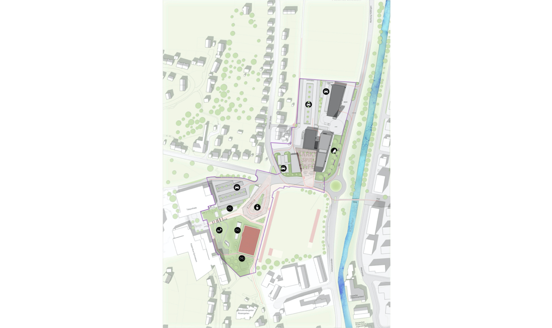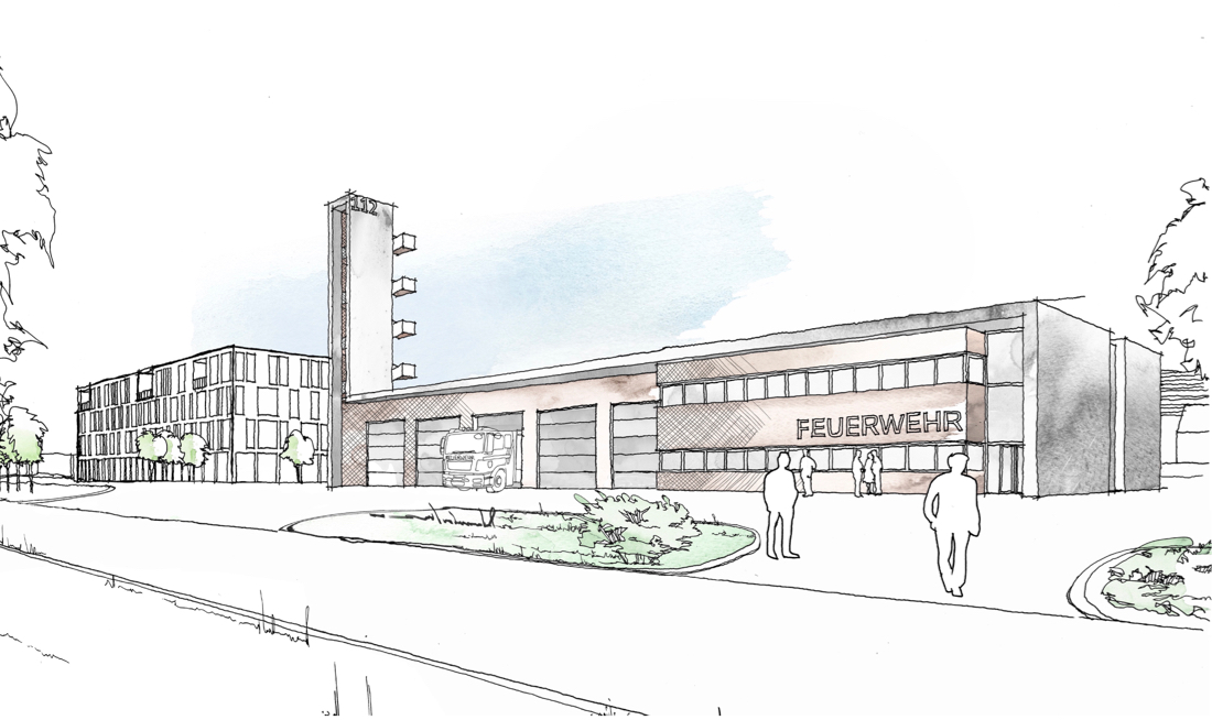 An der Hofwiesenstraße wurden Gebäude mit Gewerbenutzung und Wohnraum um einen großzügigen Platz geplant; gleich im Anschluss soll das neue Feuerwehrhaus entstehen.