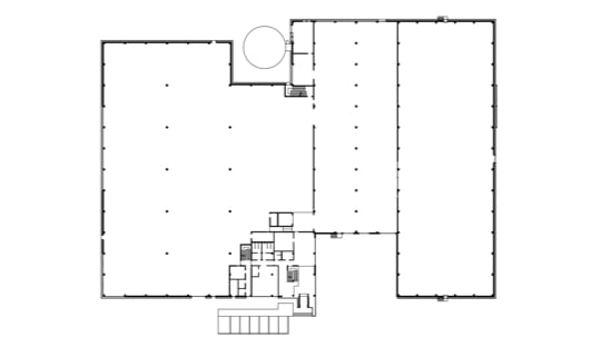 Der Grundriss zeigt 3 Gebäudeteile in verschiedenen Höhen mit Foyer und Verwaltungstrakt.