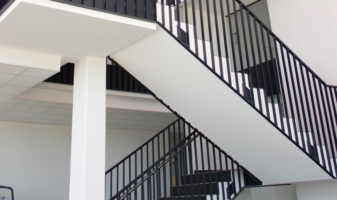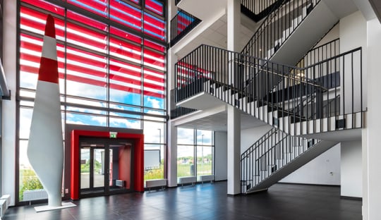 Das Foyer ist das Herzstück des gesamten Ensembles und verbindet alle Bereiche vertikal und horizontal. Beeindruckend – wie eine Skulptur – befindet sich hier die freie Treppe. Die Farbigkeit der Fassade führt zu spannenden Lichtreflexionen im Innern und erinnert an die Corporate Identity des Bauherrn.