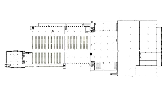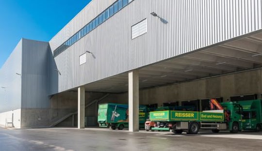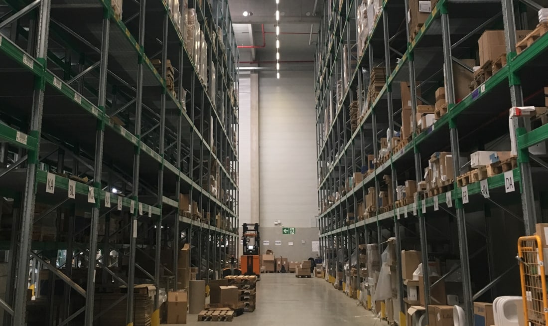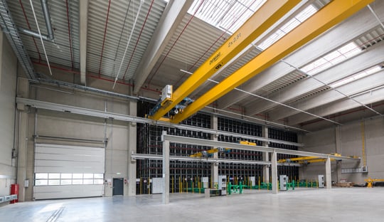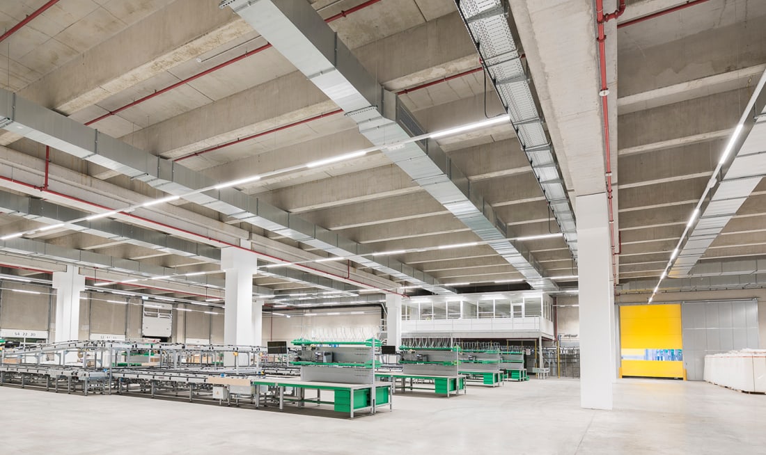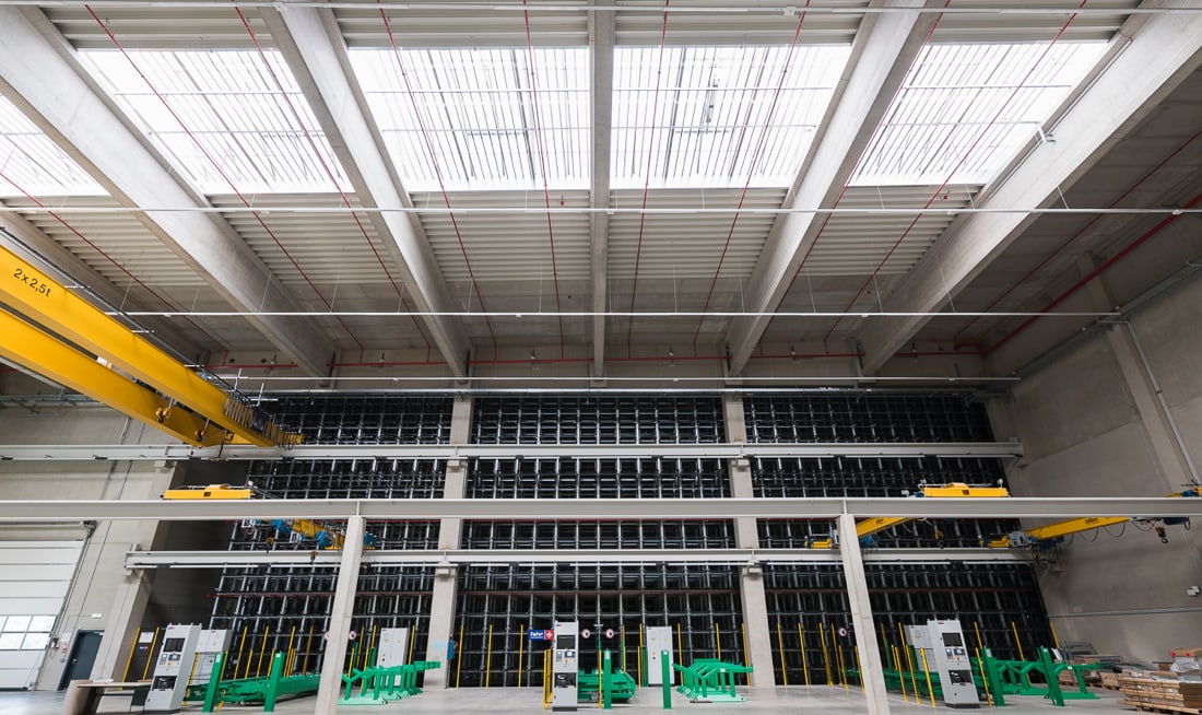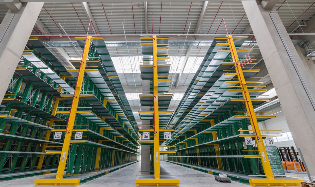 Der Gebäudekomplex umfasst verschiedene Hallen mit unterschiedlichen Funktionen wie z.B. Hochregallager, Wabenregallager und Langgutregallager. Die Palette der Produkte reicht von Abwasserrohren bis hin zu Designer-Porzellan-Badewannen. Eine Krananlage erstreckt sich über die gesamte Länge der Halle.