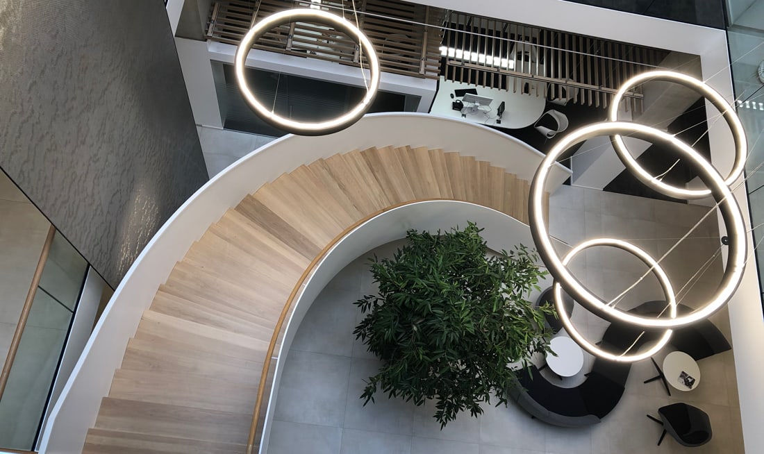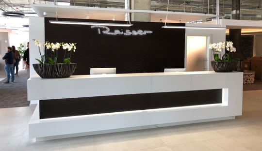 Im gesamten Gebäude werden hochwertige Materialien eingesetzt. Technikinstallationen sind sichtbar ausgeführt und bilden einen starken Kontrast zur eleganten Empfangstheke, die vom internen Design-Team entwickelt wurde.