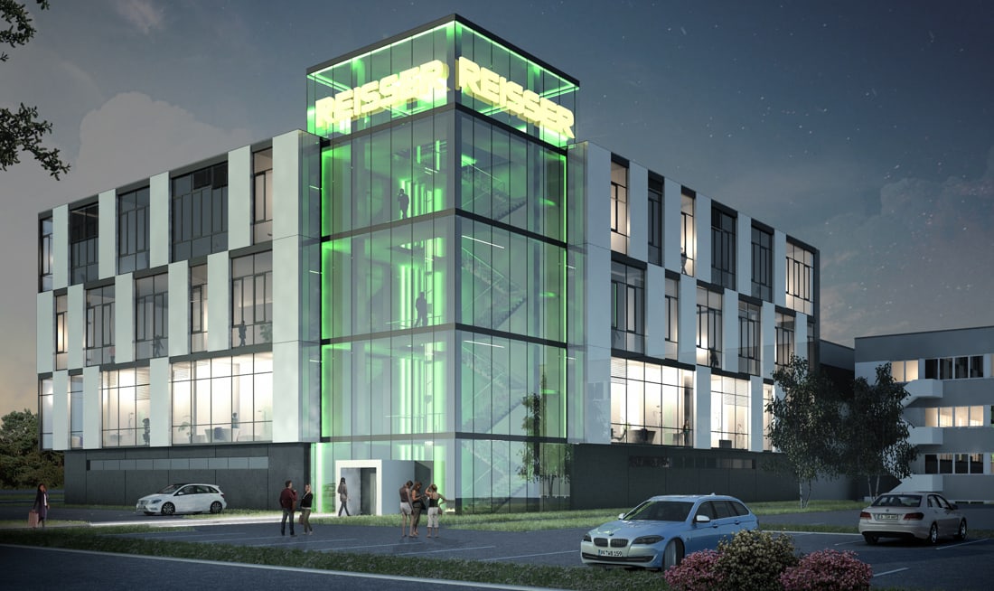 Am Abend leuchtet der Glaskubus, die vertikale Verkehrsfläche des Gebäudes, von Weitem.