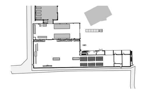 Der zweite BA schließt im Süden an eine bestehende Halle an. Der östliche Teil der Produktionshalle ist relativ schmal gehalten, damit genug Platz für die Anlieferung der Rohmaterialien bleibt.