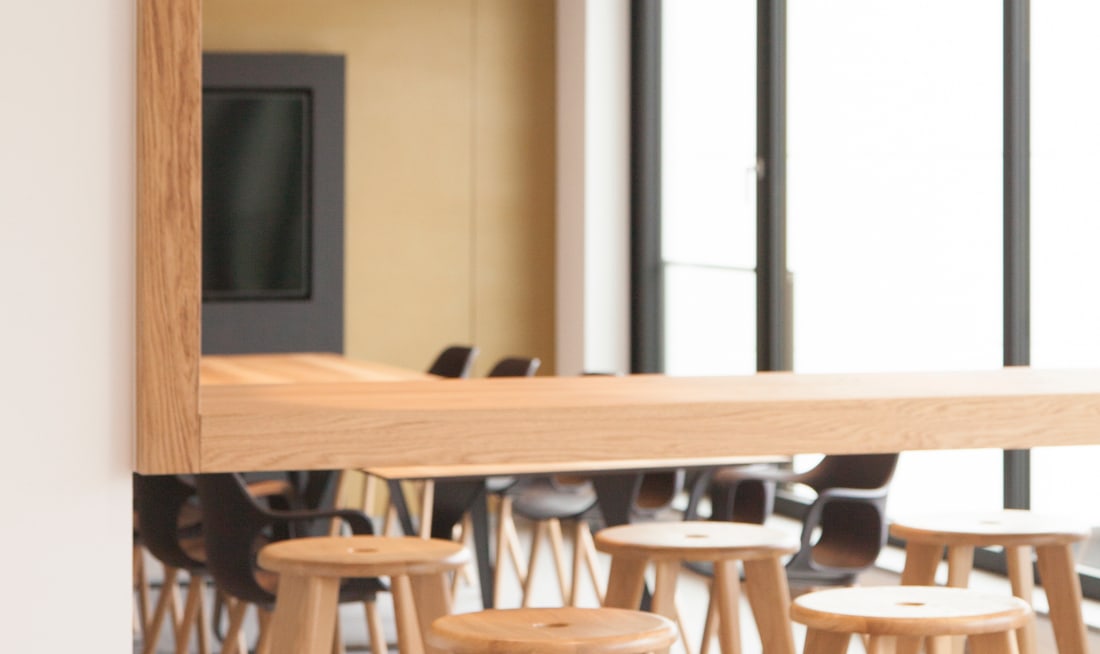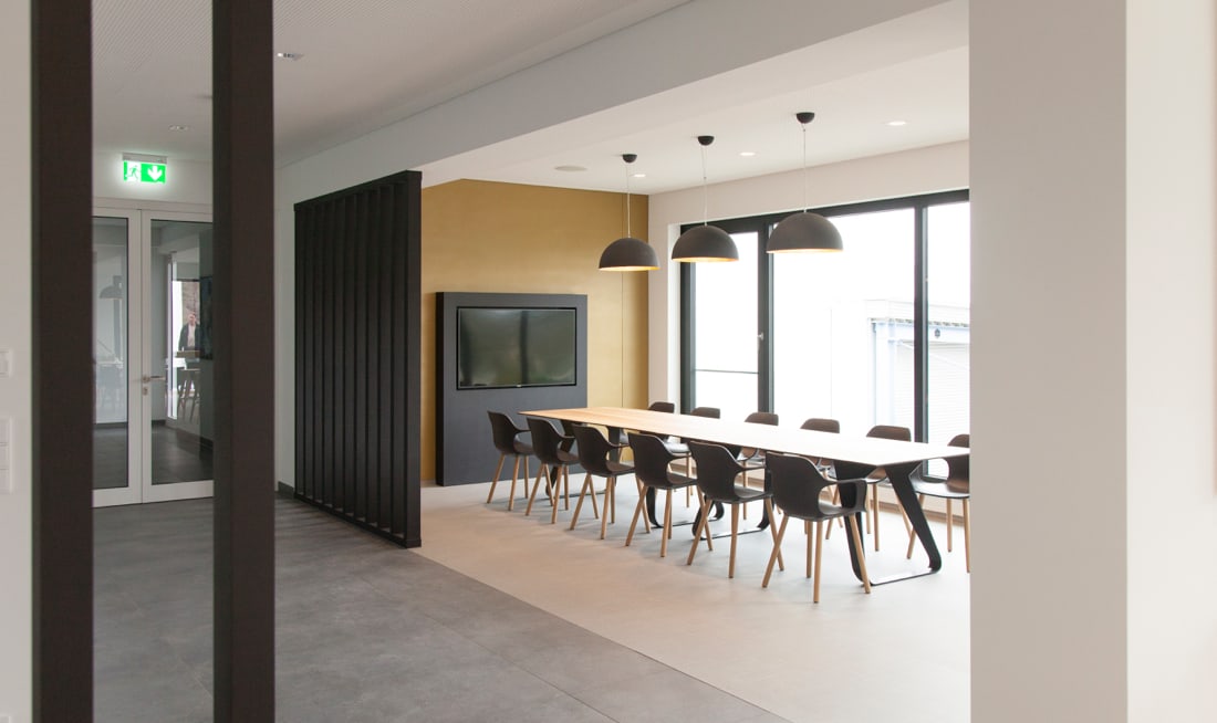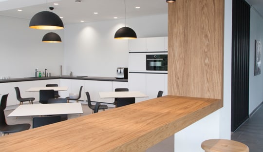 Die Mitarbeiterräume sind im 1. OG angeordnet. Ein Raumteiler aus Massivholz zoniert den Verzehrbereich und den Mitarbeiter-Besprechungsraum. Ausgesuchte, hochwertige Materialen sowie exquisite Beleuchtung sorgen für einen angenehmen Aufenthalt.